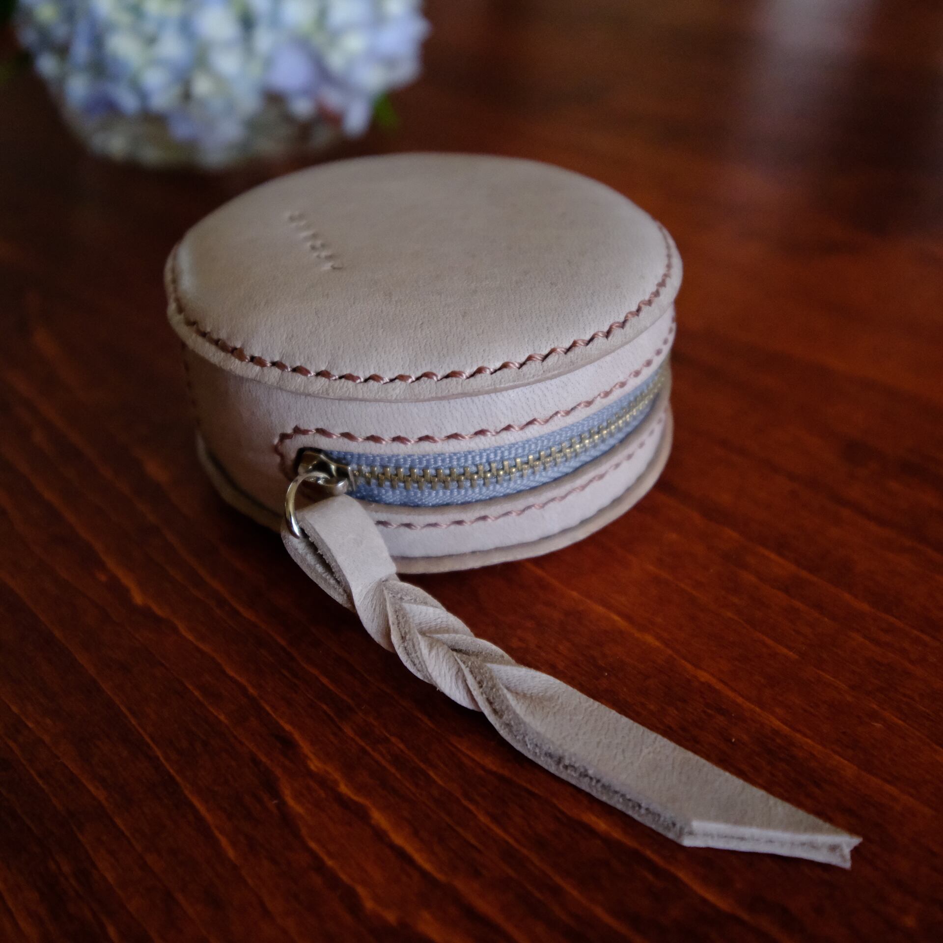 コロンとしてかわいい、手に収まるくらいのちょうどいいサイズのマカロンみたいなポーチです。